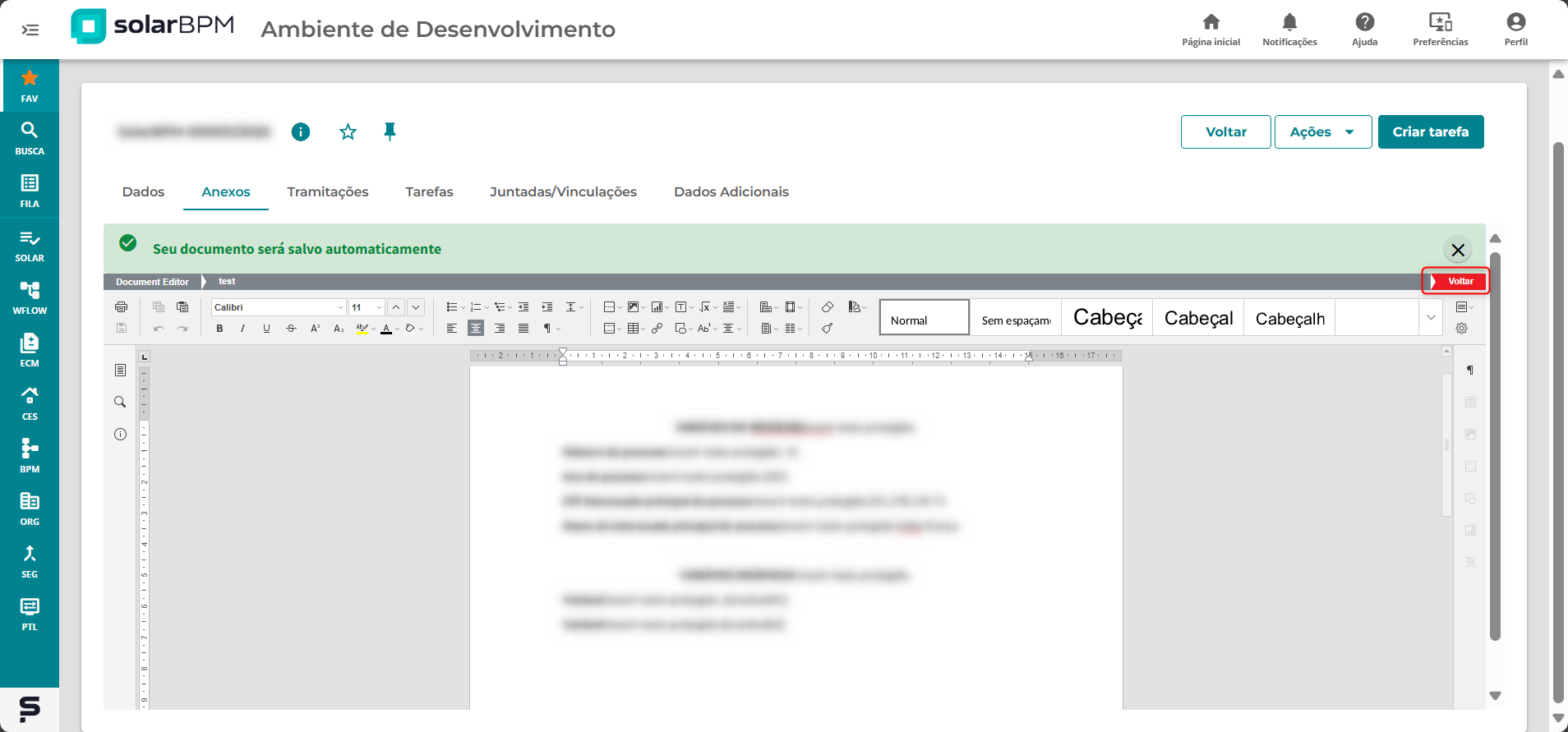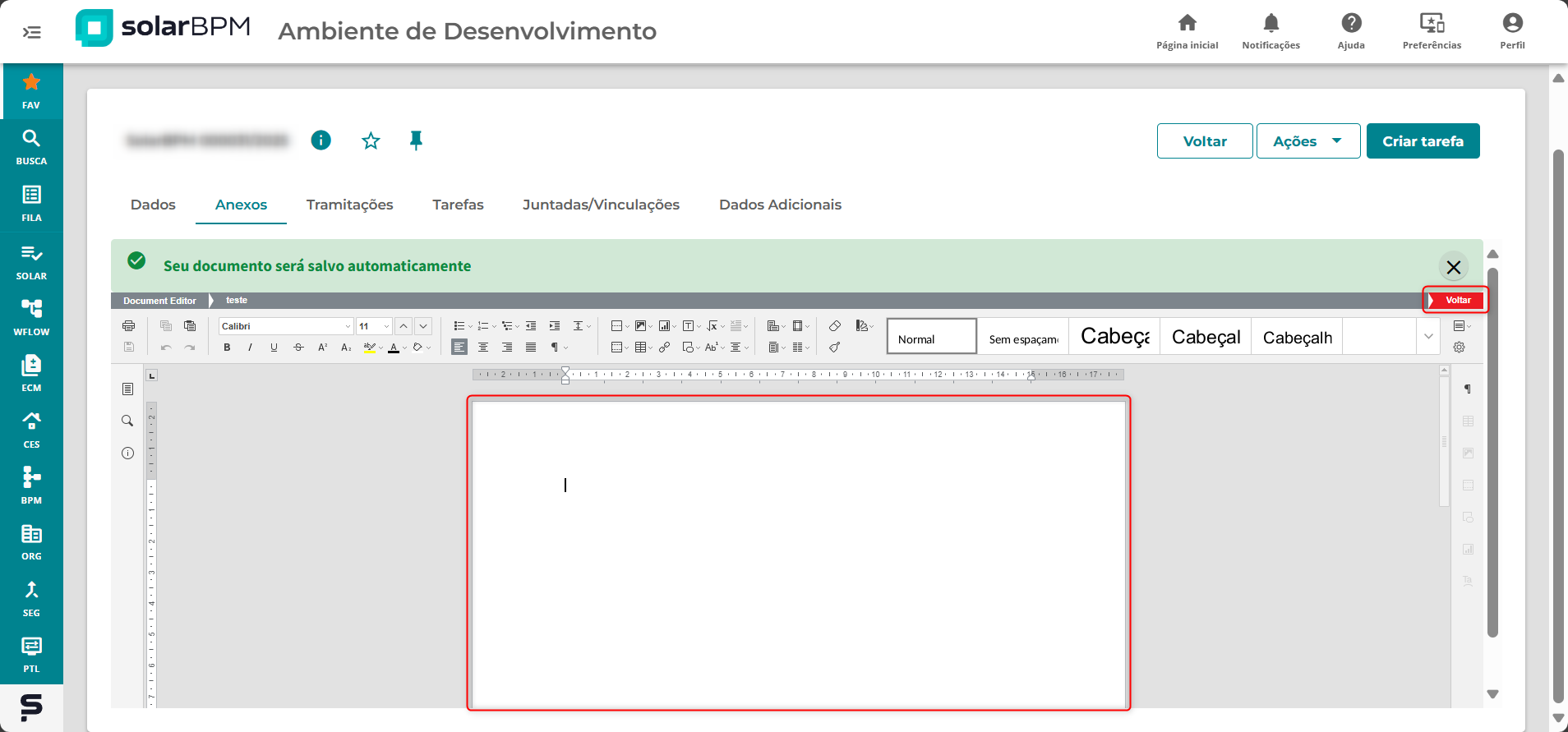 Passo 4: será aberto o ‘Editor Online’ (funcionalidade muito parecido com o MS Word ou Writer LibreOffice) com uma página em branco. Confeccione o anexo e, ao finalizar, feche-o clicando em ‘Voltar’.