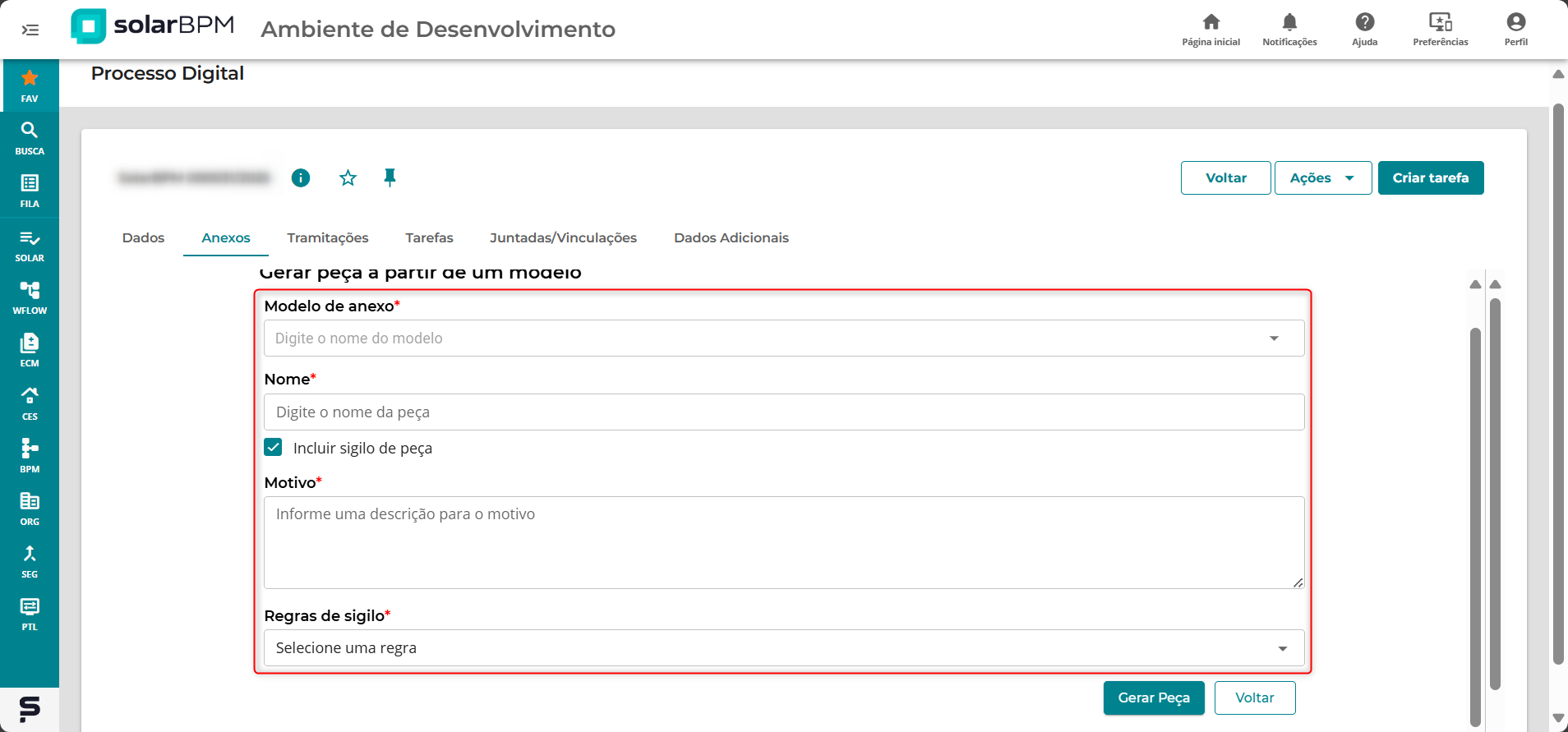Para inserir anexos a partir de um modelo pré-definido, siga o passo a passo abaixo: