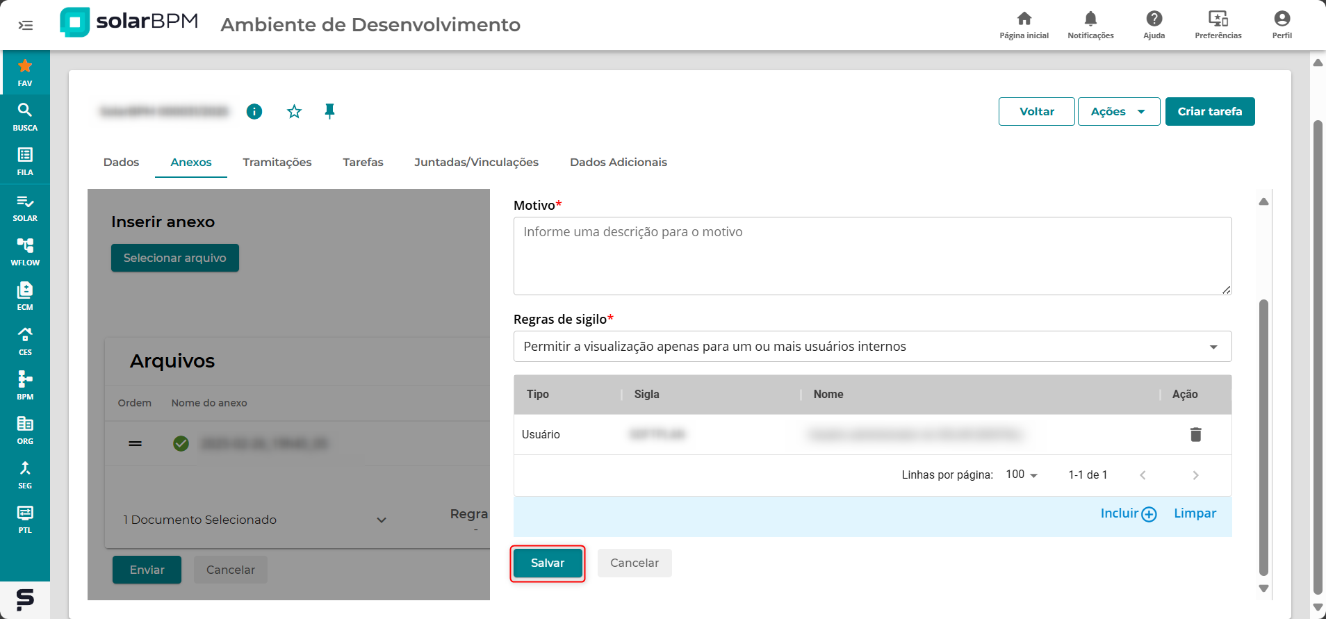 É possível aplicar o sigilo ao inserir anexos a partir do seu computador, de um modelo em branco ou de um modelo pré-definido.