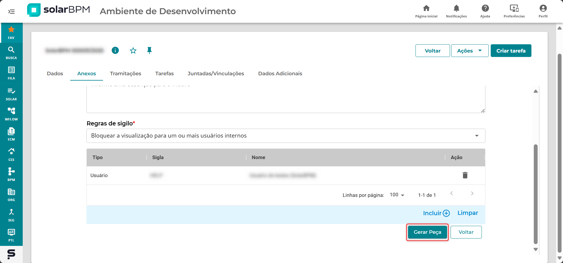 Passo 3: busque pelos usuários em questão, clique em ‘Selecionar’ e por fim, clique em ‘Gerar Peça’ para efetivar a ação.