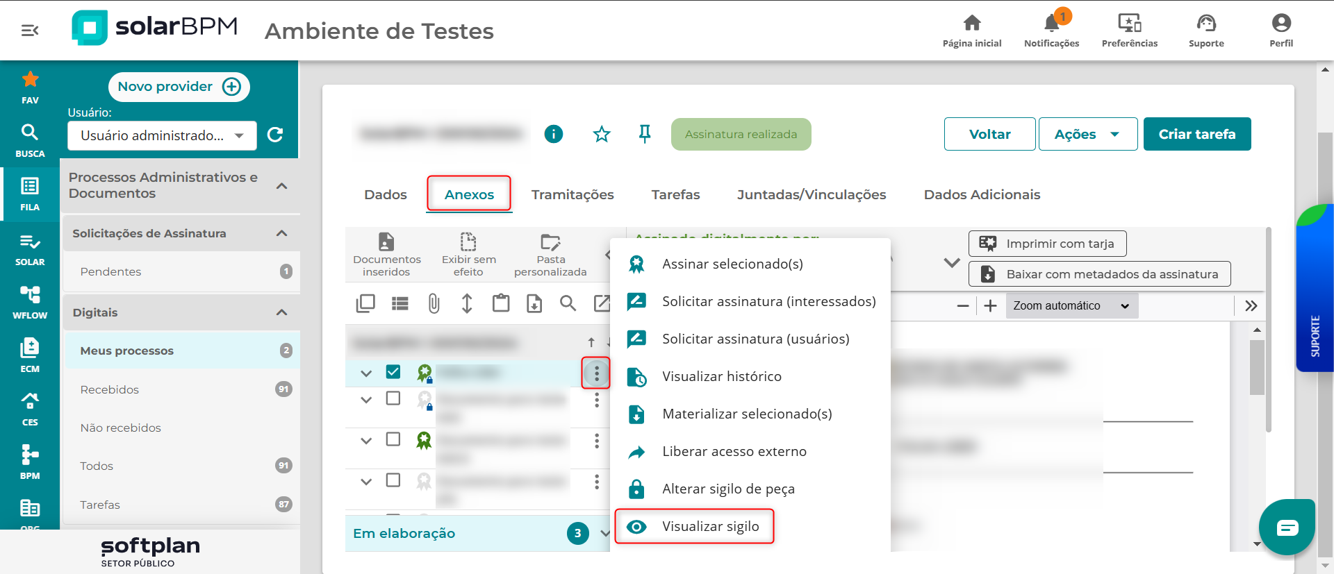 Passo 1: com o processo aberto, na aba ‘Anexos’, localize a peça sigilosa em questão, clique no ícone de “3 pontos” e, em seguida, escolha a opção ‘Visualizar sigilo’.