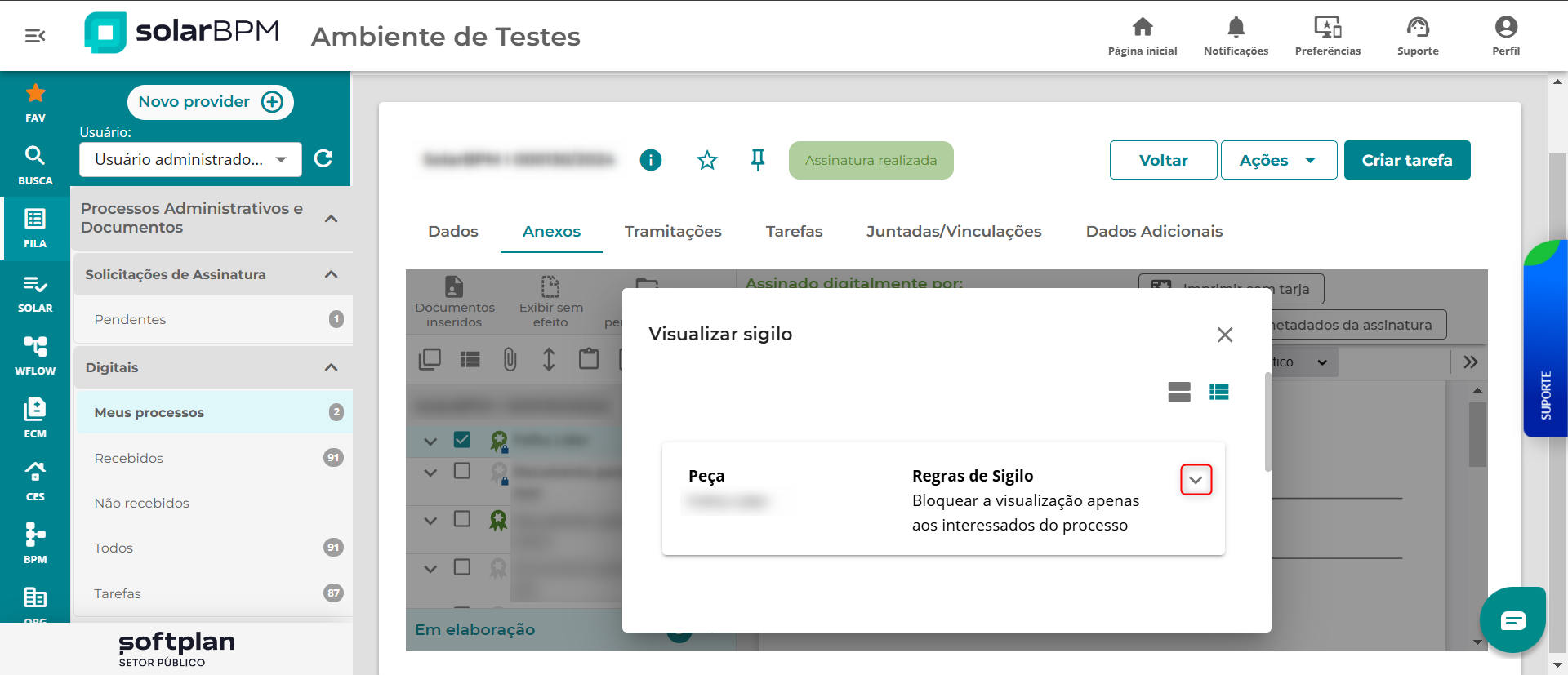 ❗É possível realizar esta ação em lote somente nas peças já publicadas na pasta digital, entretanto, se uma peça que não possui sigilo for selecionada juntamente com outras que possuem, aquela sem sigilo não será exibida na visualização.